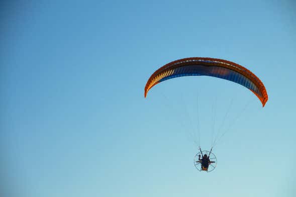 We'll climb up to 300 meters high (984 feet) and we'll make a route of up to 10 kilometres (6.2 miles). As this is a motorized paraglider, we can adjust the flight as we wish, both the altitude and the direction. During the crossing, we'll pass by beaches, golf courses and even, if we're lucky, we'll be able to see dolphins in the Atlantic Ocean.