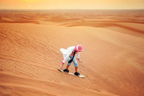 On the morning of your tour, you'll be picked up from your hotel in Dubai, leaving the hustle and bustle of the city behind and heading into the stunning landscapes of the surrounding desert. Your 4x4 all-terrain vehicle will bounce easily over the sand dunes, taking you to the best possible sandboarding spots.