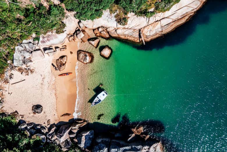 A medida que nos alejamos del muelle, sentiremos la brisa marina en el rostro y empezaremos a contemplar cómo la estampa costera se torna más amplia. La primera parada del paseo la haremos en la isla de Macuco, donde podréis sumergiros en sus aguas cristalinas. Podréis tomar uno de los flotadores que os proporcionaremos y disfrutar bajo el sol. ¡Qué delicia!