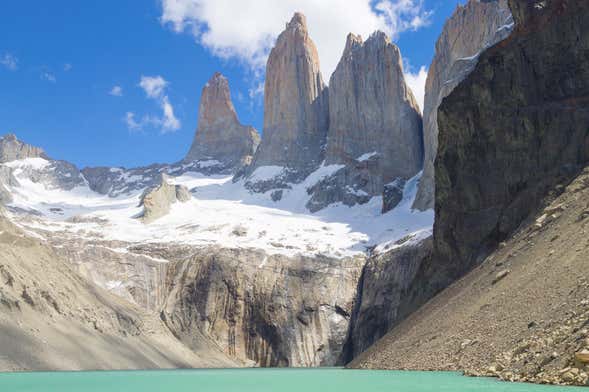 El aumento de la dificultad de la ruta tendrá su recompensa, porque tras poco más de una hora de senderismo alcanzaremos uno de los lagos cristalinos del parque. Junto a este bello paisaje, disfrutaréis de las preciosas vistas de los picos de granito Central, Monzino y Dagostini, también conocidos como las Torres del Paine.