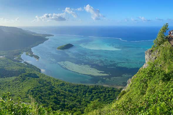 La cumbre del monte peninsular se sitúa a 465 metros de altura. En la cima haremos una pausa de 45 minutos para contemplar con calma los paisajes. Desde este privilegiado lugar veremos los verdes valles que se extienden a sus pies y las islas Benitiers y Fourneau, situadas respectivamente al norte y al sur de la península de Le Morne Brabant.