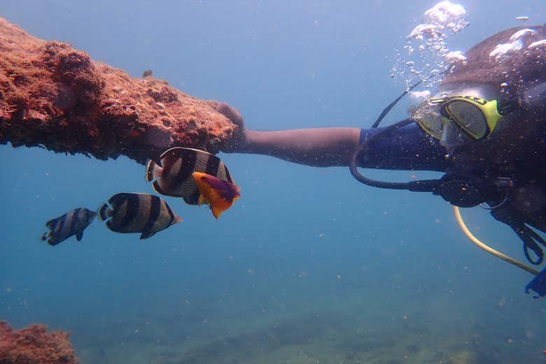 A continuación, nos equiparemos con el traje, las aletas, las gafas y la bombona y tendremos una primera toma de contacto en el agua para poner en práctica los consejos. Así, cuando estemos preparados, empezaremos a bajar poco a poco hasta alcanzar unos 10 metros de profundidad y vivir una experiencia submarina durante unos 40 o 50 minutos. ¡Os encantará!