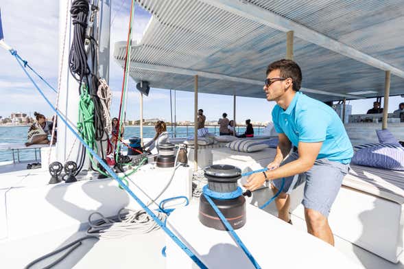 Nous nous retrouverons à l'heure indiquée au club nautique d'El Arenal. Nous vous accueillerons à bord d'un confortable catamaran qui vous emmènera en croisière dans l'ouest de Majorque. Partez à la découverte de la baie de Palma !