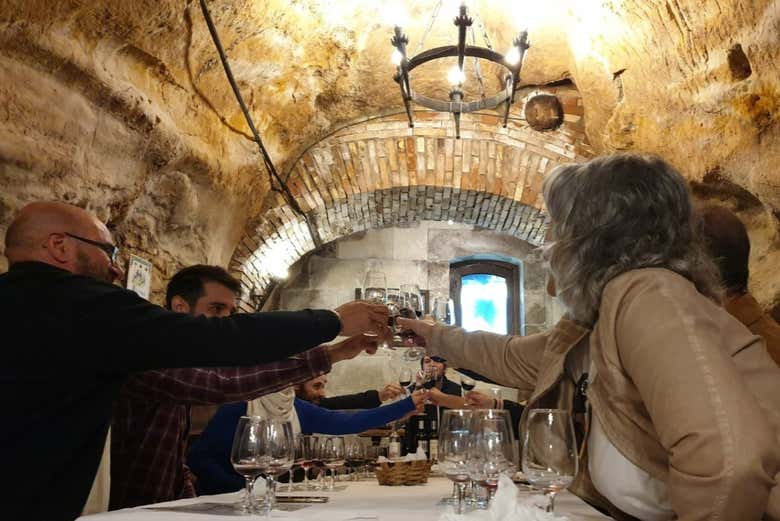 Arrivati all'enoteca, conosceremo la prima cantina, così da imparare come si produceva il vino locale. Poi, scenderemo le scale che conducono alle cantine sotterranee viaggiando indietro nel tempo fino al XV secolo per continuare a conoscere le particolarità del vino in queste gallerie.