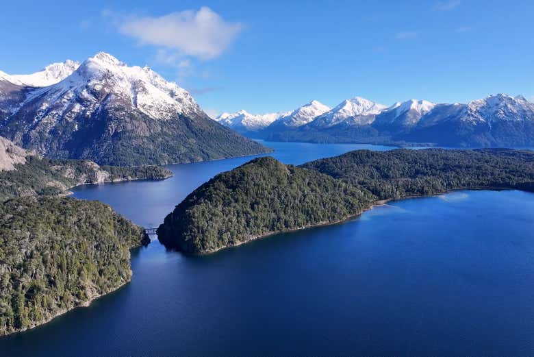 Seguiremos o percurso pelo Parque Municipal Llao Llao e passaremos pela Ponte Angostura, onde se unem os lagos Moreno e Nahuel Huapi. Além do mais, você terá vistas incríveis da baía López e do Cerro Capilla. Mais adiante, chegaremos a um dos pontos panorâmicos mais importantes do tour, o mirante de onde avistaremos a Península Llao Llao e seus lagos. Um clássico cartão-postal de Bariloche que você não esquecerá jamais. De lá, atravessaremos a ponte sobre o lago Moreno, de onde avistaremos a lagoa El Trébol.