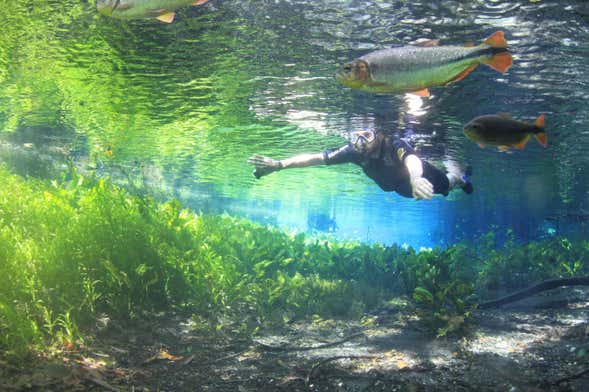 No horário definido, nos encontraremos no Aquário Natural, um lugar espetacular situado a 8 quilômetros do centro de Bonito. Lá, faremos uma atividade inesquecível de flutuação onde você se sentirá como um verdadeiro peixe dentro do aquário!