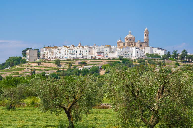 No caminho até Locorotondo, você poderá admirar a paisagem, repleto de fazenda de oliveiras e intermináveis vinhedos do Vale de Itria.