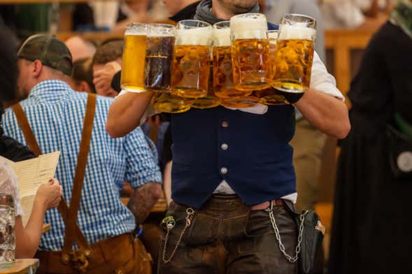 Iremos a um dos pavilhões e teremos a sorte de tomar duas cervejas de um litro cada uma e um prato principal ao mais puro estilo bávaro!