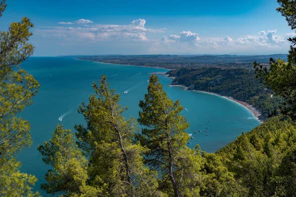 A bordo dessa típica motocicleta italiana, você pode descobrir a região de Marche de uma perspectiva completamente diferente e por conta própria. A cidade costeira de Numana tem vistas incríveis do mar Adriático graças à sua localização na ladeira sul do Monte Conero.