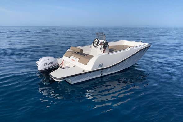 Lá, explicaremos de forma breve e simples como pilotar um barco semirrígido sem licença. Esse barco de quatro metros de comprimento, chamado Taida 2, é muito fácil de conduzir. Conta ainda com toldo de proteção solar, geladeira portátil e escada de banho.